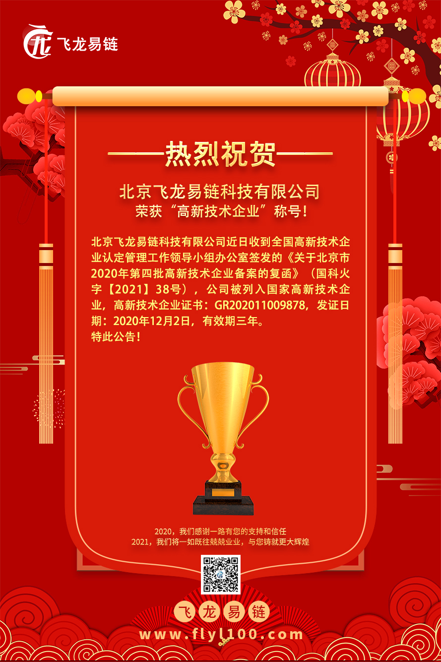北京飞龙易链科技有限公司近日收到全国高新技术企业认定管理工作领导小组办公室签发的《关于北京市2020年第四批高新技术企业备案的复函》(国科火字【2021】38号),公司被列入国家高新技术企业。